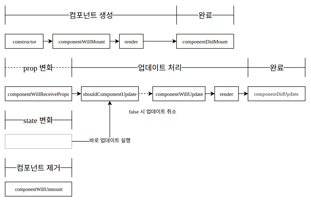 - 컴포넌트의 prop(속성)이 변경될 때엔 componentWillReceiveProps -> shouldComponentUpdate -> componentWillUpdate-> render -> componentDidUpdate 순으로 진행