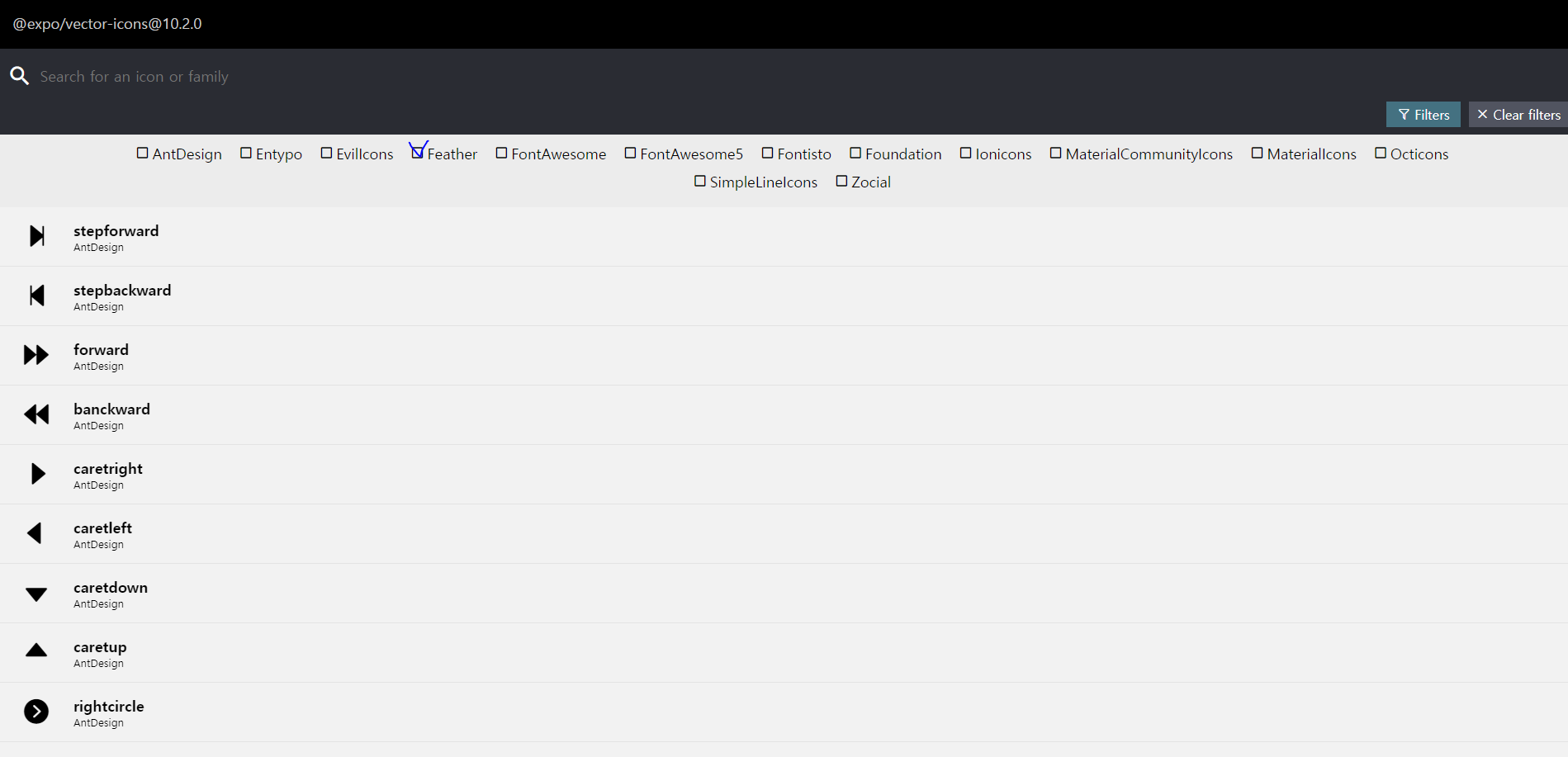 이후 @expo/vector-icons directory. 라는 링크를 클릭하면 아이콘을 검색할 수 있다.
